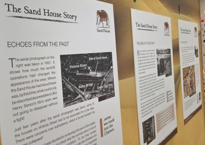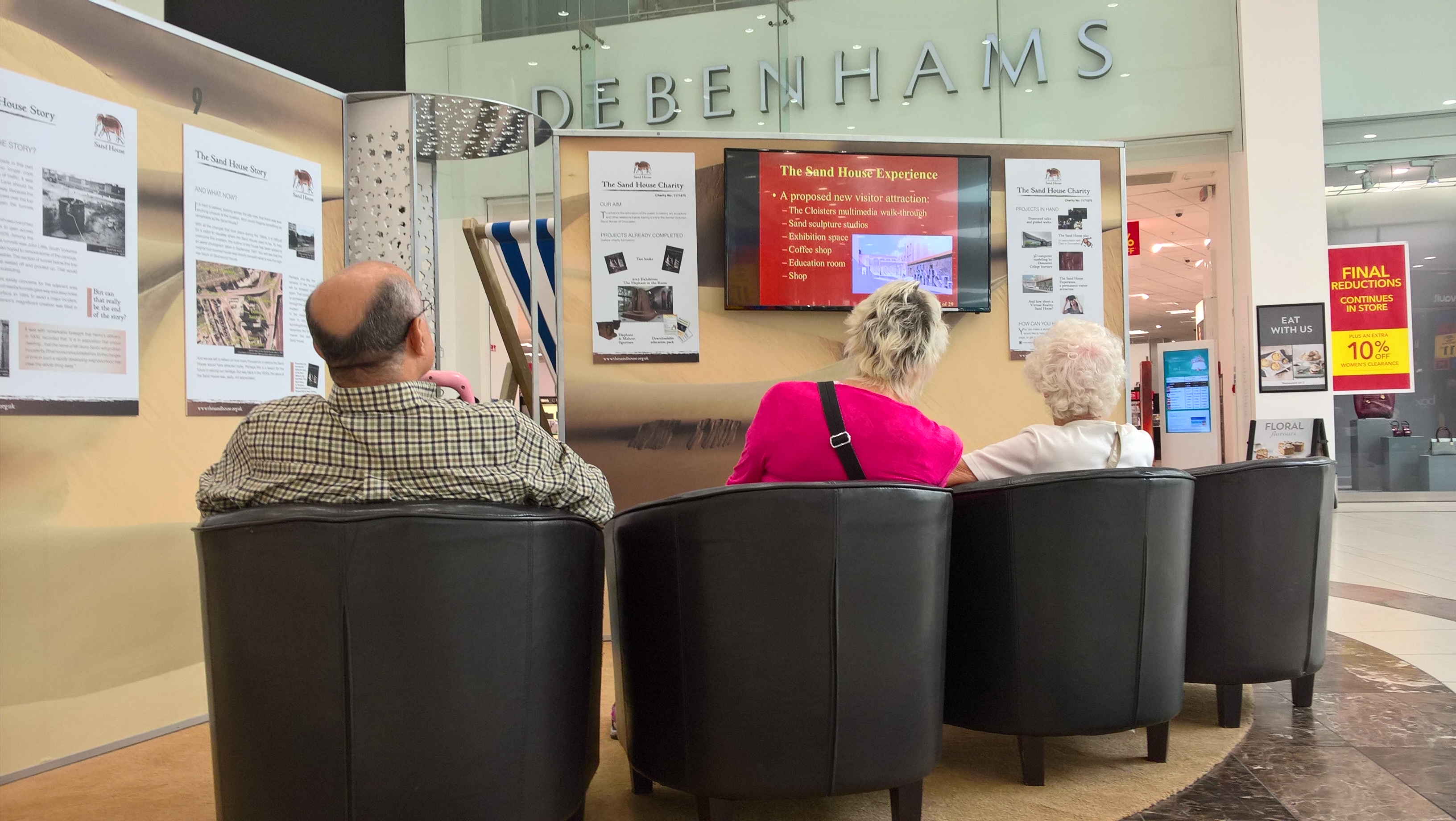 Located in a prime spot, just outside the Debenhams store, the Sand House exhibition occupied two-thirds of what is known as the ‘event pod’. On the vertical faces of the event pod we displayed nine story boards, briefly telling the Sand House story. We also had a digital display screen running continuously, showing a looped video of images. This proved to be a popular attraction, with many people taking advantage of the seating to view the entire 23 minutes of video.